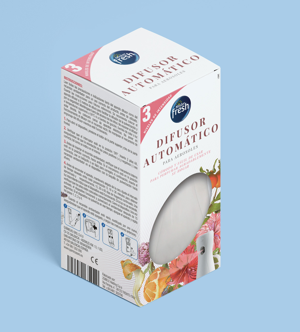 Diseño de packaging del difusor automático para los supermercados Aldi. Cliente: Químicas Oro